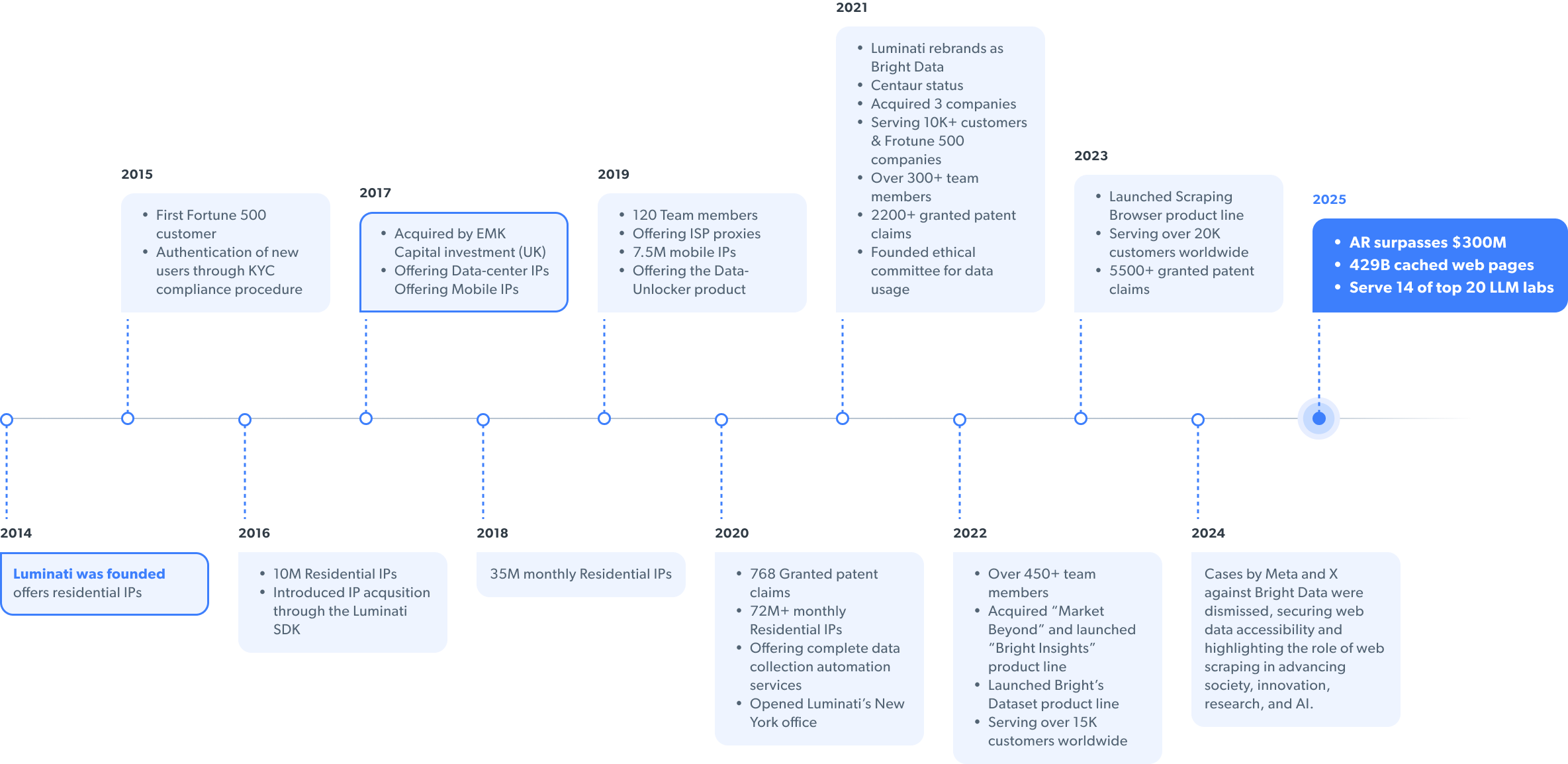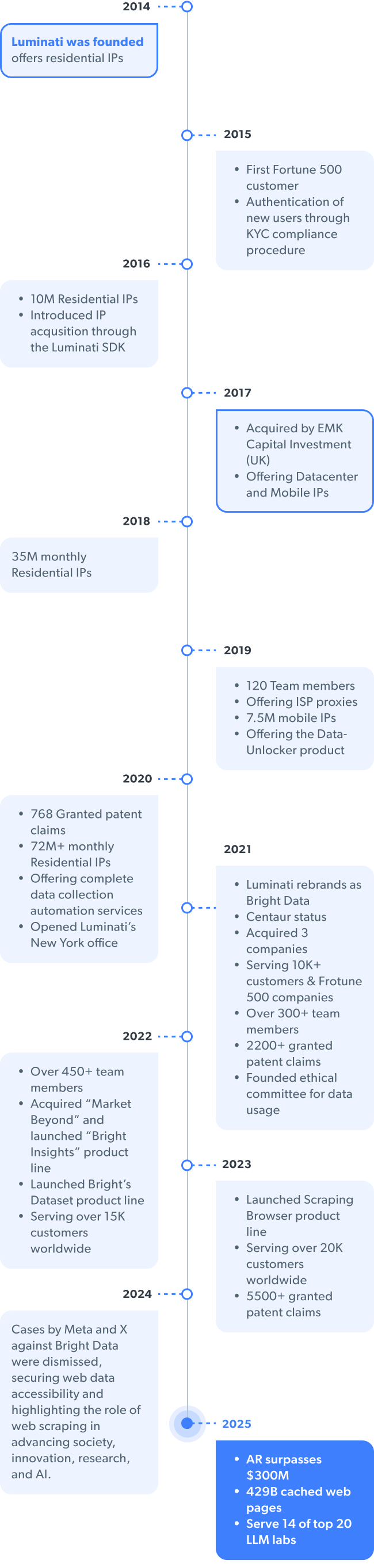 当社はプロキシインフラから世界No.1のウェブデータ収集プラットフォームへと成長しました。この進化を記念し、Luminati NetworksをBright Dataに改称しました。現在、当社の独自技術は業界最高水準であり、フォーチュン500企業、学術機関、世界中の主要企業に採用されています。