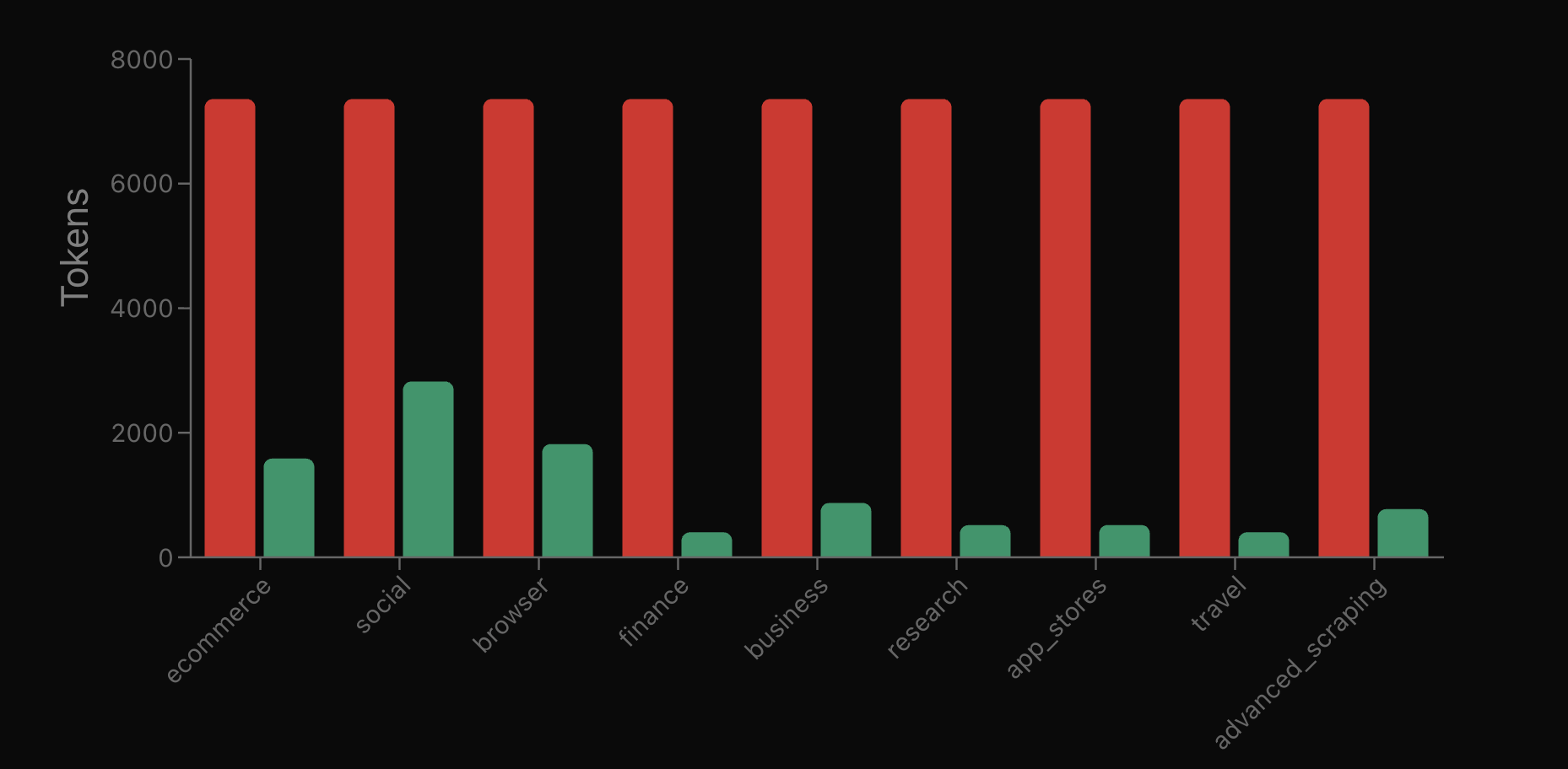 • Social media group has the highest token usage at 2,823 tokens due to more complex tool schemas, but still saves 61.6%