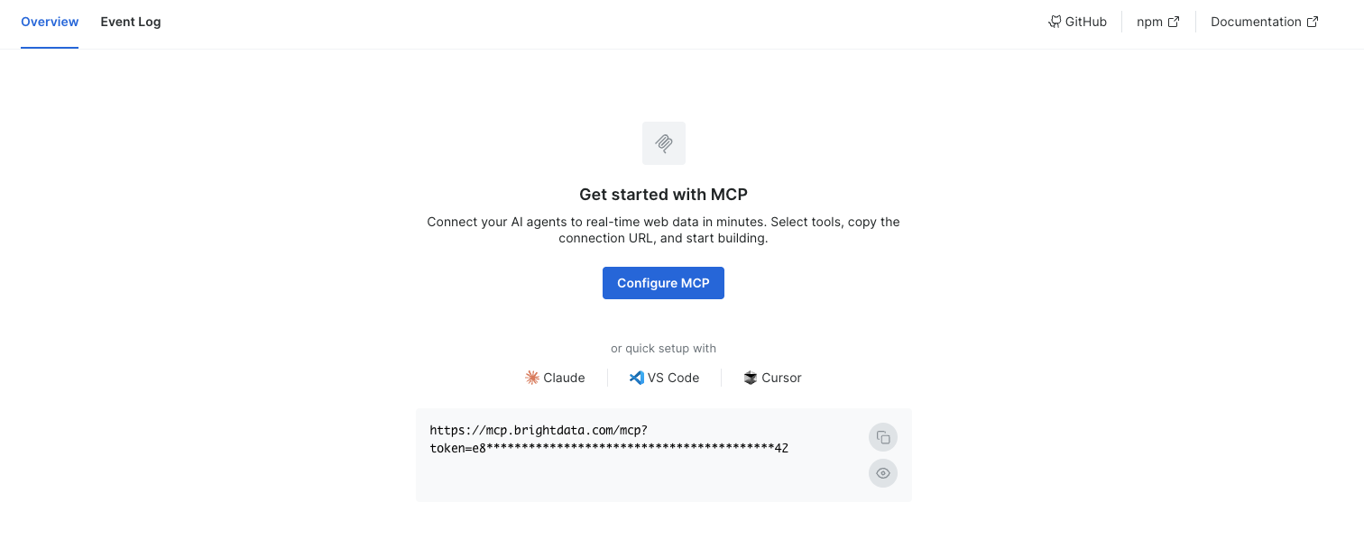 Visit our MCP control panel to access the Configuration Wizard. Enter your API token, select your tools, and get a ready-to-use connection URL.