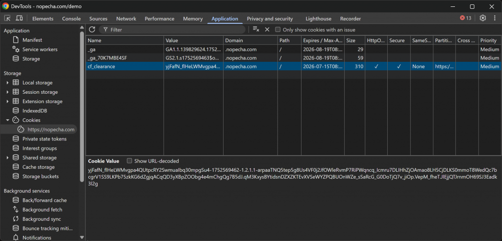 検証が成功すると、Cloudflareサーバーはcf_clearanceクッキーを発行し、この特定のユーザーセッションがウェブサイトへのアクセスを許可されていることを示します:
