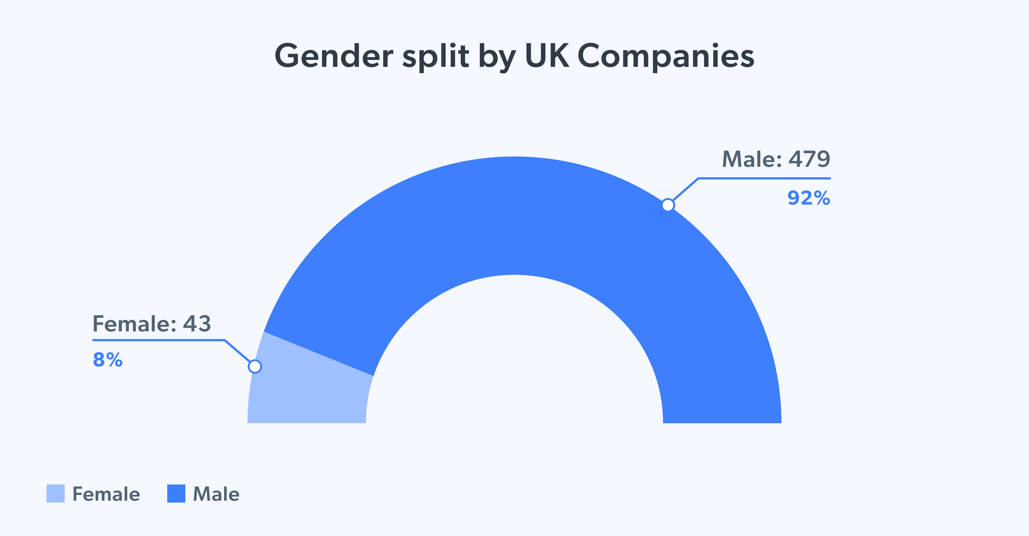 では、大企業ではどうか? 残念ながら、この情報は入手が困難です。Crunchbaseデータベースの分析からも明らかなように、女性経営者の割合がさらに低いと推測されます。さらに英国(および欧州)では、企業設立時にこの情報が収集されないため、追跡が極めて困難なのです。