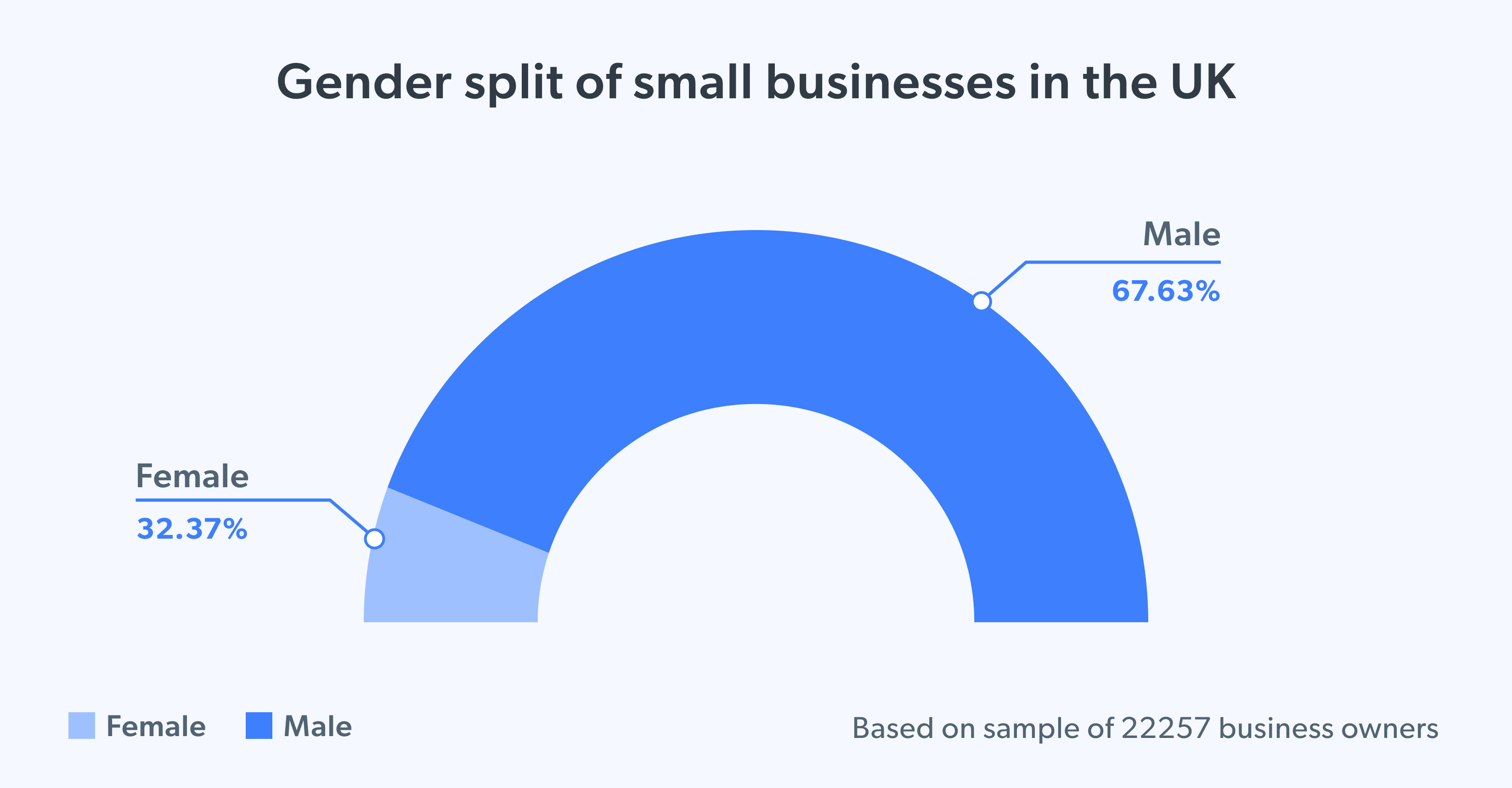 UENIの調査によると、英国の小規模事業者22,257人のサンプルでは32.37%が女性でした。これははるかに良い数値ですが、小規模事業のみを対象としたものであり、あらゆる業種を網羅しているわけではありません。
