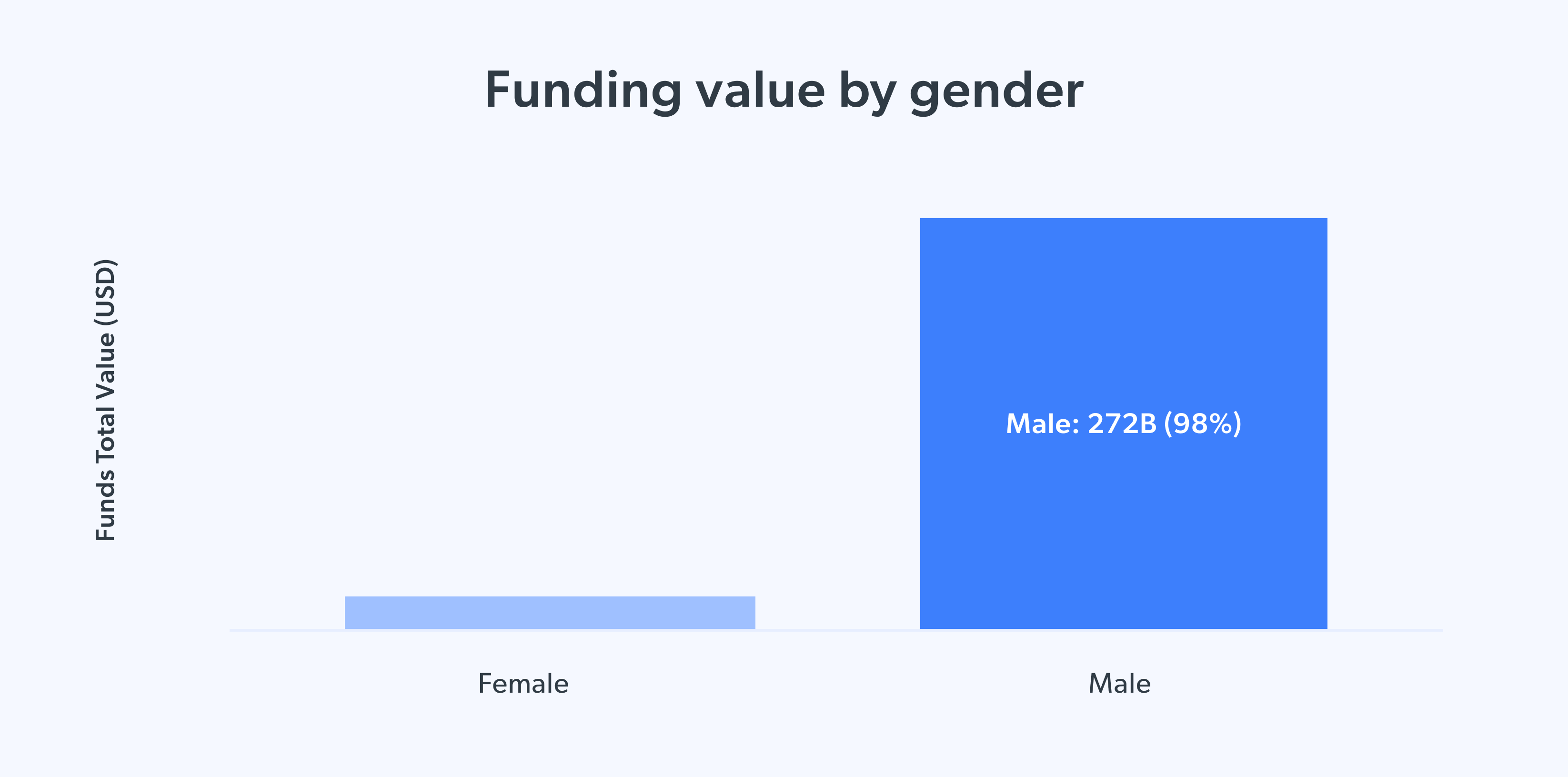 私たちの調査によると、女性起業家への資金調達は男性起業家と比べてはるかに低い水準にあります。その差は98%もの資金格差です。この数値は驚くほど低く、棒グラフで統計を見てもその差が認識しづらいほどです!