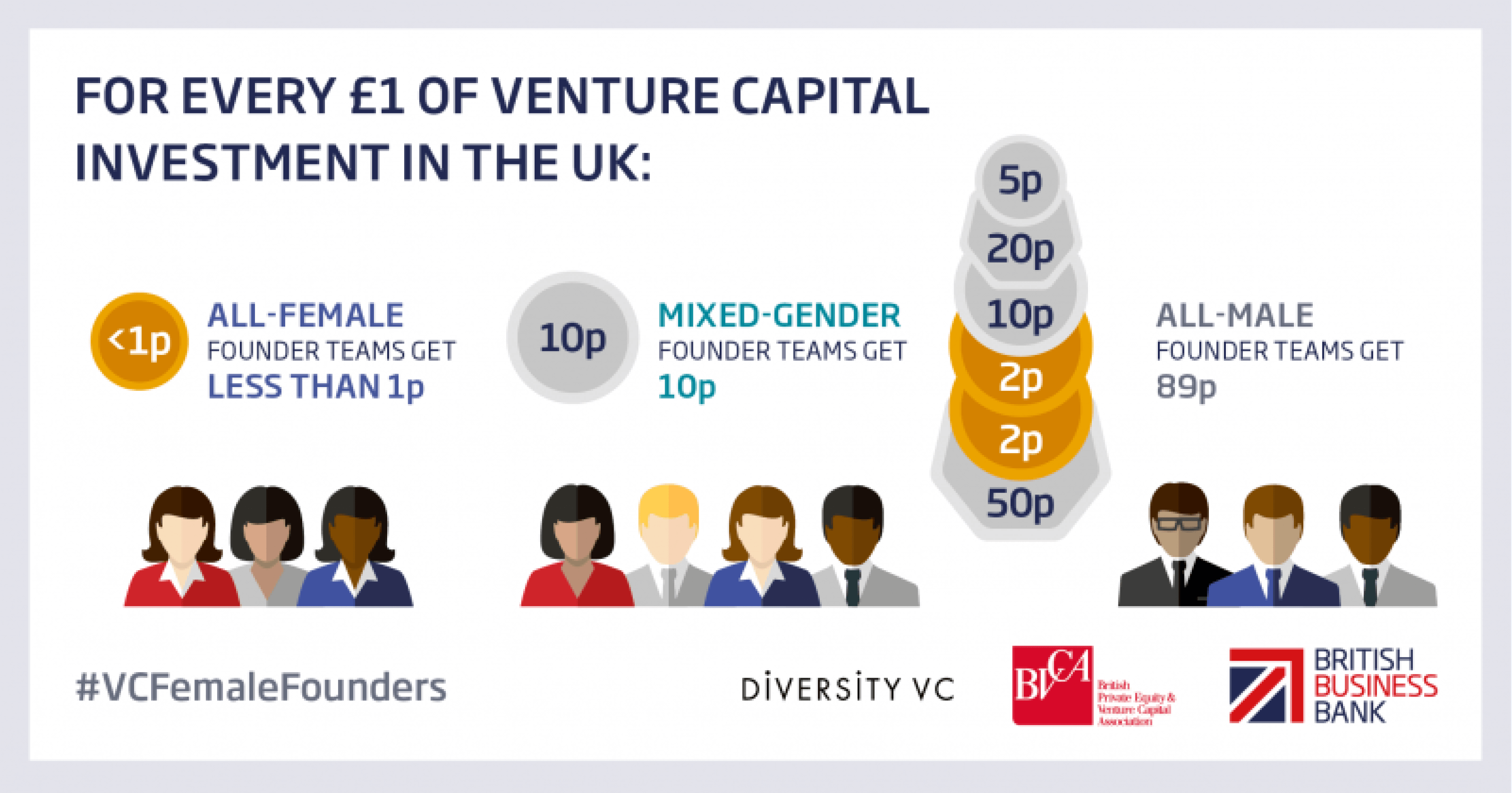 さらに2017年には、英国ビジネス銀行がダイバーシティVCおよびBVCAと共同で、女性主導企業がベンチャーキャピタルへのアクセスにおいて直面する具体的な障壁を特定する調査を委託しました。その結果はご覧の通り、恥ずべきものです。