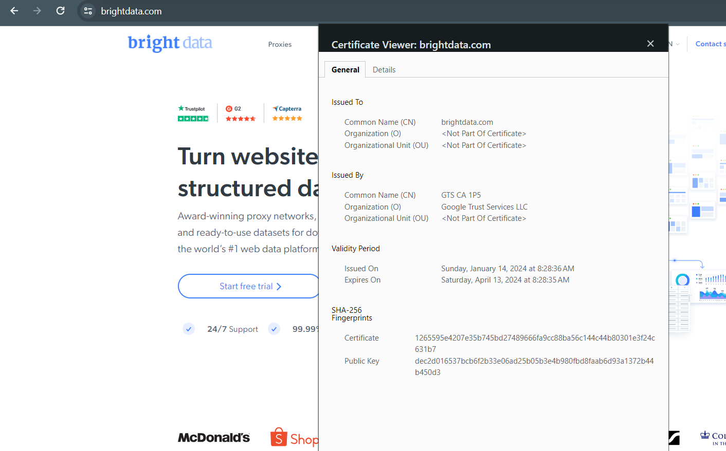 クライアントは発行元認証局でサーバーのセキュリティ証明書を検証し、ウェブサーバーの公開鍵で暗号化されたプレマスター秘密鍵を返信します。サーバーはプレマスター秘密鍵を復号し、クライアントとサーバー双方がセッション鍵を生成することで、ウェブ閲覧用の安全な接続を確立します。例えば、https://brightdata.com/ を開いた際に送信される TLS 証明書は以下の通りです: