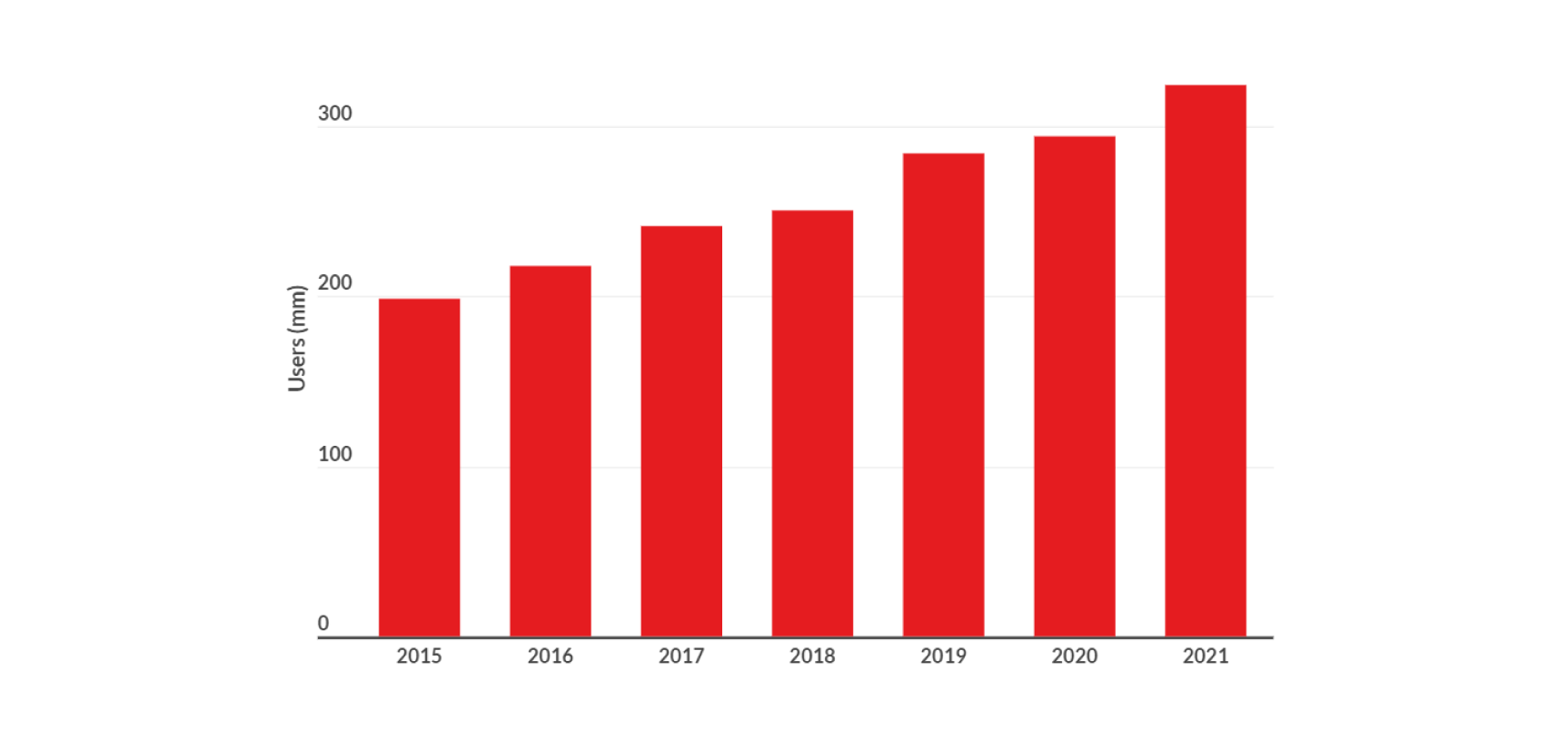 過去5年間で、デートアプリの利用者数は2億人弱から2021年には驚異的な3億2300万人へとほぼ倍増した。