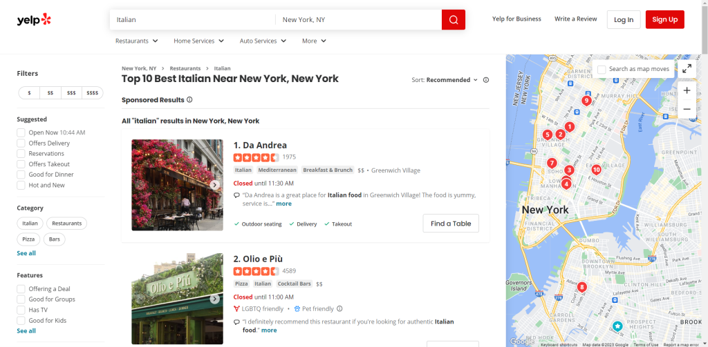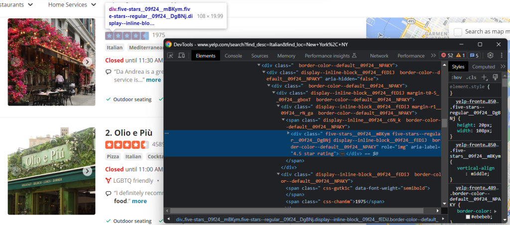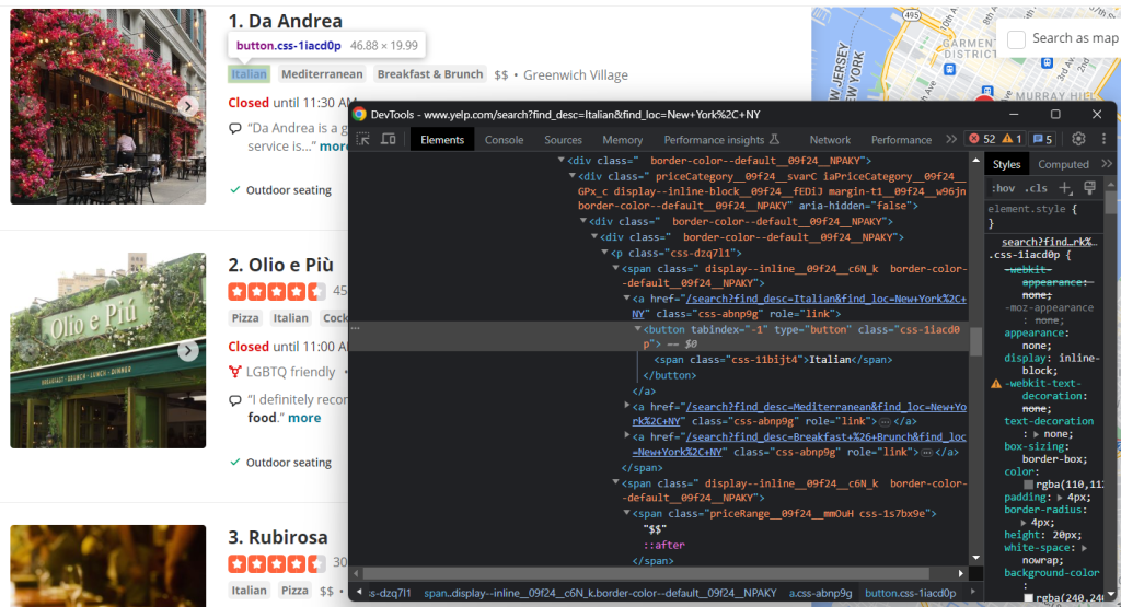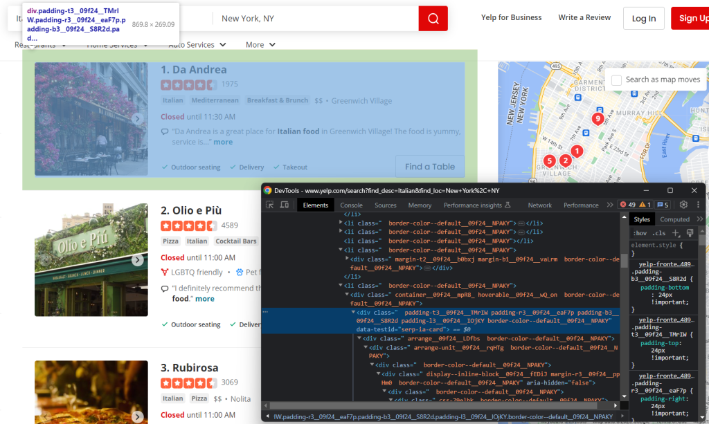 Yelpを閲覧し、スクレイピングしたいページを特定します。このガイドでは、New Yorkで高評価のイタリアンレストランのリストからデータを取得する方法を見ていきます。