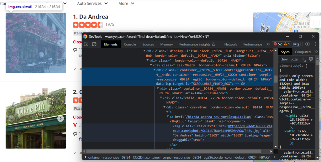 import requestsnnfrom bs4 import BeautifulSoupnnimport csvnn# support data structures to implement thenn# crawling logicnnvisited_pages = []nnpages_to_scrape = ['https://www.yelp.com/search?find_desc=Italianu0026find_loc=New+York%2C+NY']nn# to store the scraped datannitems = []nn# to avoid overwhelming Yelp's servers with requestsnnlimit = 5nni = 0nn# until all pagination pages have been visitednn# or the page limit is hitnnwhile len(pages_to_scrape) != 0 and i u003c limit:nn # extract the first page from the arraynn url = pages_to_scrape.pop(0)nn # mark it as u0022visitedu0022nn visited_pages.append(url)nn # download and parse the pagenn page = requests.get(url)nn soup = BeautifulSoup(page.text, 'html.parser')nn # select all item cardnn html_item_cards = soup.select('[data-testid=u0022serp-ia-cardu0022]')nn for html_item_card in html_item_cards:nn # scraping logicnn item = {}nn image = html_item_card.select_one('[data-lcp-target-id=u0022SCROLLABLE_PHOTO_BOXu0022] img').attrs['src']nn name = html_item_card.select_one('h3 a').textnn url = 'https://www.yelp.com' + html_item_card.select_one('h3 a').attrs['href']nn html_stars_element = html_item_card.select_one('[class^=u0022five-starsu0022]')nn stars = html_stars_element.attrs['aria-label'].replace(' star rating', '')nn reviews = html_stars_element.parent.parent.next_sibling.textnn tags = []nn html_tag_elements = html_item_card.select('[class^=u0022priceCategoryu0022] button')nn for html_tag_element in html_tag_elements:nn tag = html_tag_element.textnn tags.append(tag)nn price_range_html = html_item_card.select_one('[class^=u0022priceRangeu0022]')nn # this HTML element is optionalnn if price_range_html is not None:nn price_range = price_range_html.textnn services = []nn html_service_elements = html_item_card.select('[data-testid=u0022services-actions-componentu0022] p[class^=u0022tagTextu0022]')nn for html_service_element in html_service_elements:nn service = html_service_element.textnn services.append(service)nn # add the scraped data to the objectnn # and then the object to the arraynn item['name'] = namenn item['image'] = imagenn item['url'] = urlnn item['stars'] = starsnn item['reviews'] = reviewsnn item['tags'] = tagsnn item['price_range'] = price_rangenn item['services'] = servicesnn items.append(item)nn # discover new pagination pages and add them to the queuenn pagination_link_elements = soup.select('[class^=u0022pagination-linksu0022] a')nn for pagination_link_element in pagination_link_elements:nn pagination_url = pagination_link_element.attrs['href']nn # if the discovered URL is newnn if pagination_url not in visited_pages and pagination_url not in pages_to_scrape:nn pages_to_scrape.append(pagination_url)nn # increment the page counternn i += 1nn# extract the keys from the first object in the arraynn# to use them as headers of the CSVnnheaders = items[0].keys()nn# initialize the .csv output filennwith open('restaurants.csv', 'w', newline='', encoding='utf-8') as csv_file:nn writer = csv.DictWriter(csv_file, fieldnames=headers, quoting=csv.QUOTE_ALL)nn writer.writeheader()nn # populate the CSV filenn for item in items: