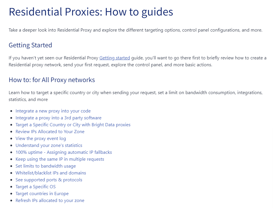 さらにBright Dataは、開発者ユーザーを支援するため、詳細なドキュメント、Webデータマスタークラス、動画、ブログ、ウェビナー、複数プログラミング言語向けコードスニペット、豊富なプリセットを提供しています。一方Smartproxyのドキュメントや情報はより簡素化されており、一般ユーザーがデータ抽出のニーズを開始する際に遥かに容易です。