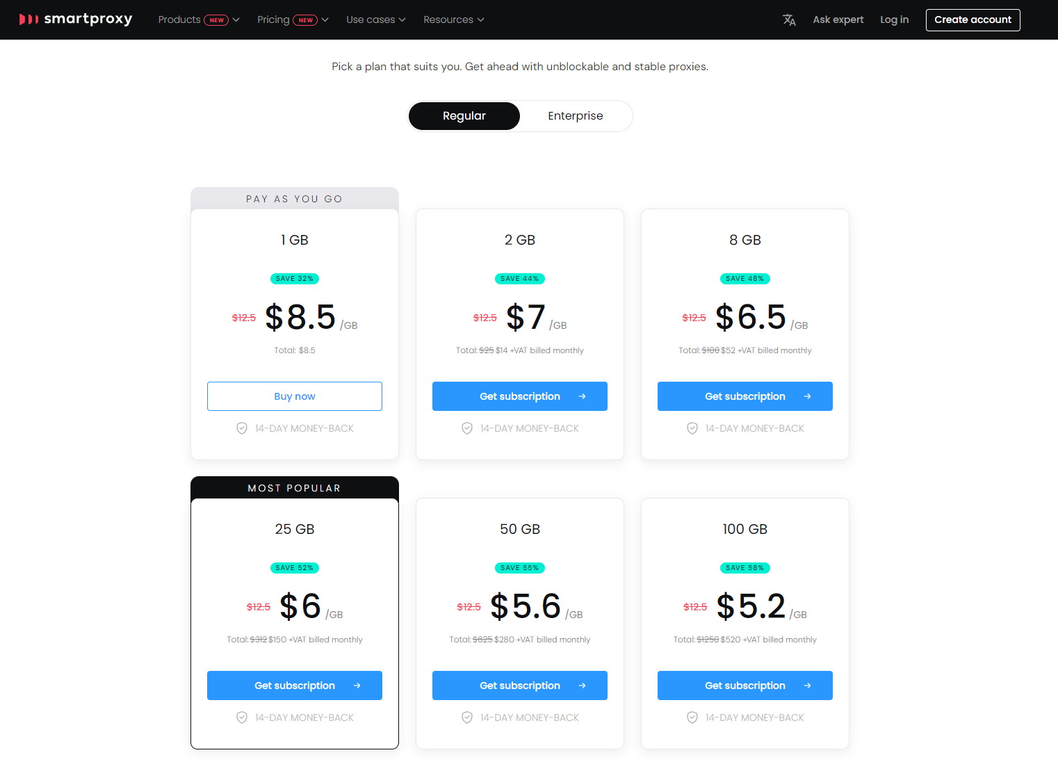 SmartproxyとBright Dataの両社とも、レジデンシャルプロキシサービス向けに複数のプランと別個のエンタープライズ層を用意しています。