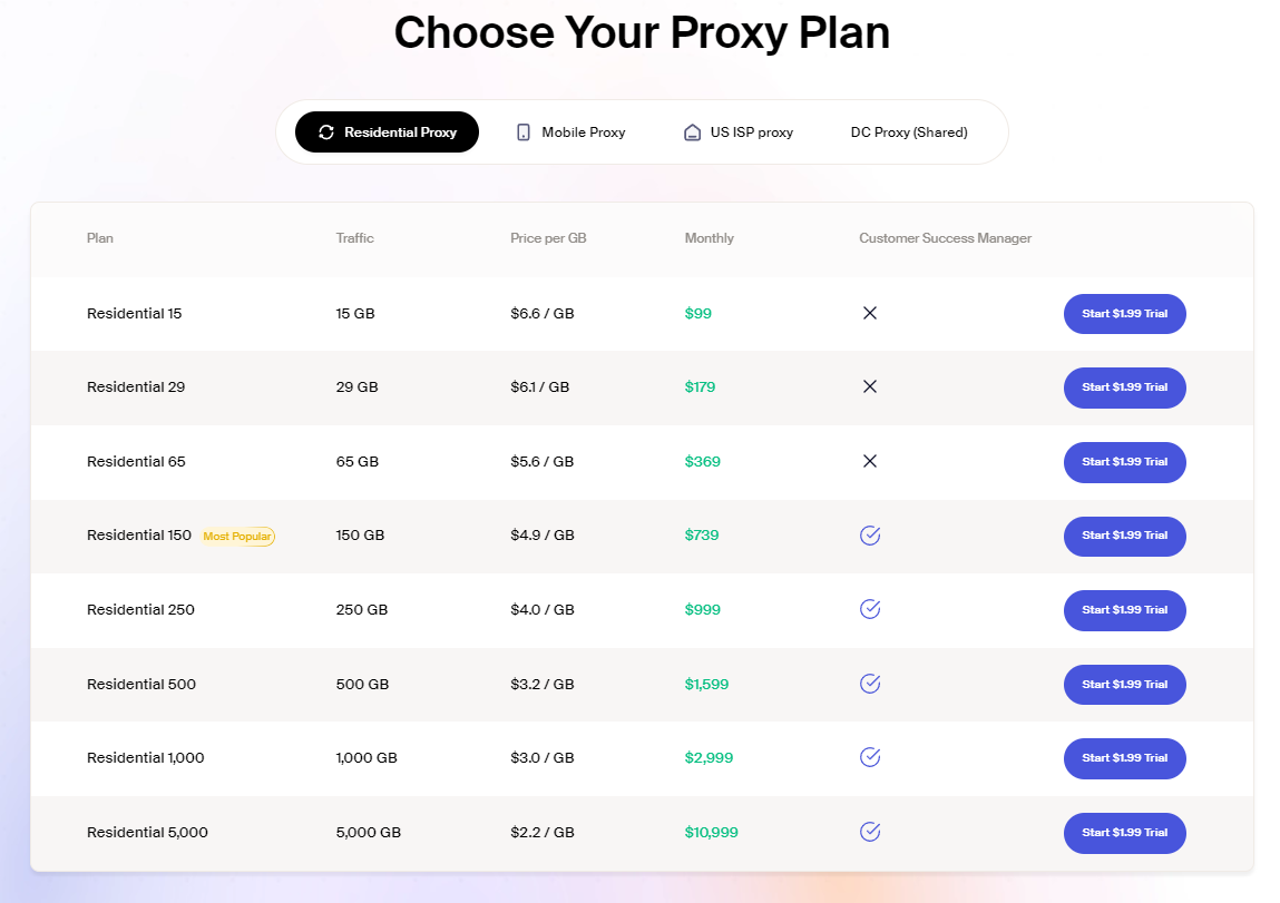 SOAXのプランはサブスクリプション制で、月額サブスクリプション、トラフィックに応じた階層化となっています。SOAXは無料トライアルを提供しておらず、代わりに1.99ドルで3日間の有料トライアル期間が利用できます。プランは1GBあたり6.6ドルから始まり、上限は15GBで、トラフィックが増えるほどGBあたりの単価は安くなります。従量課金モデルは利用できません。
