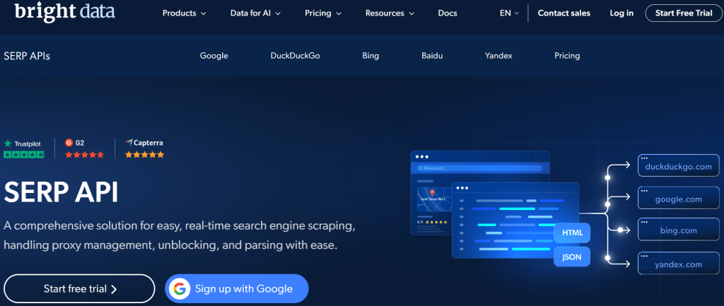 特に検索エンジンデータを対象としたタスクについては、Bright Dataの最高のソリューションはSERP APIである。このエンドポイントは、世界最大の検索エンジンからライブでリアルタイムの結果をスクレイピングする複雑さを処理します。以下のような特殊なスクレイパーのコレクションを活用することで、大規模なデータ収集が可能になります: