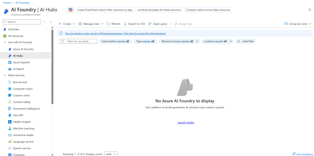 これを行うには、Azureアカウントにログインし、アイコンをクリックするか、検索バーで検索してAzure AI Foundryサービスを開きます:
