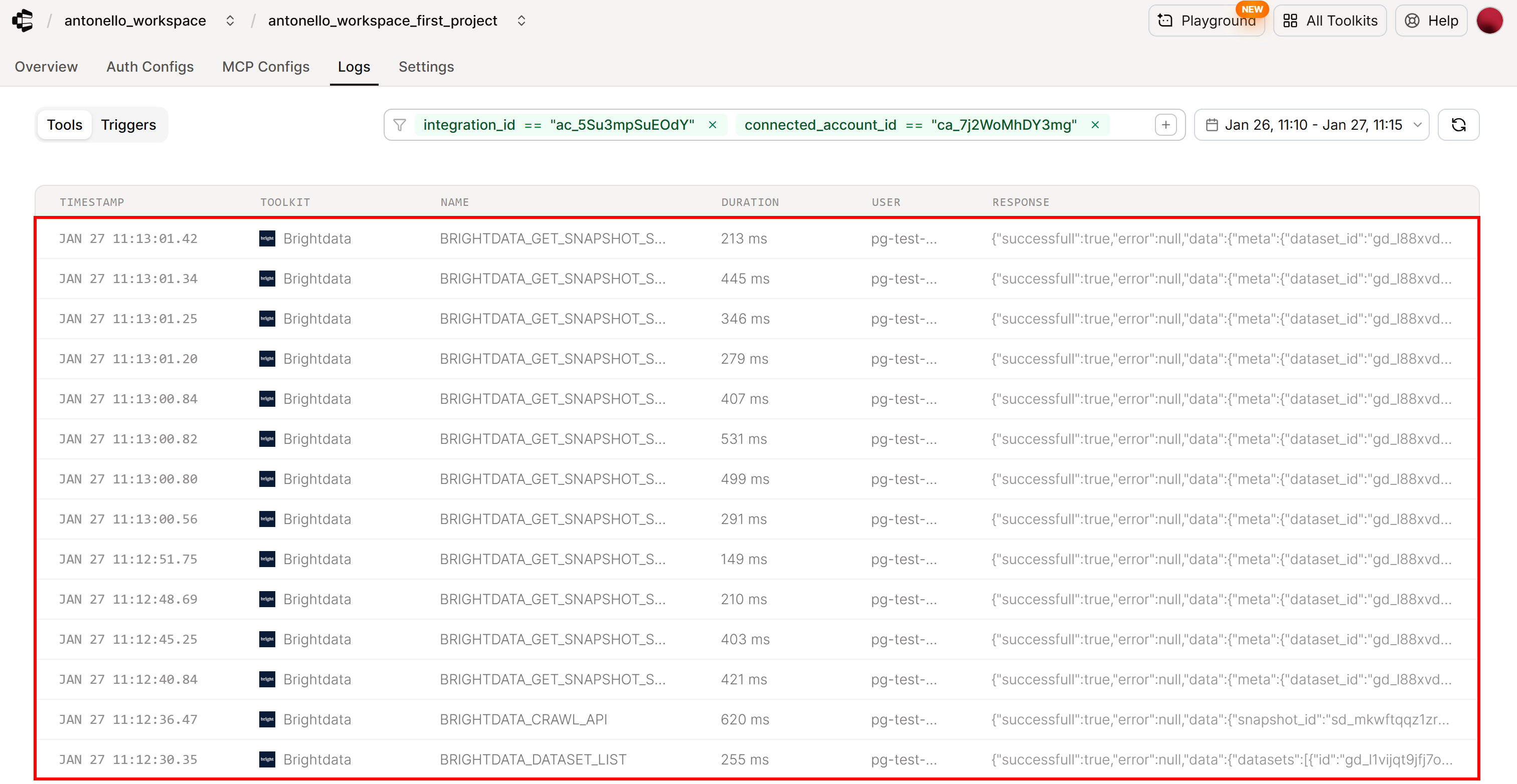 BRIGHTDATA_GET_SNAPSHOT_RESULTS)が、収集データを含むスナップショットの準備が整うまでポーリングを継続しました。