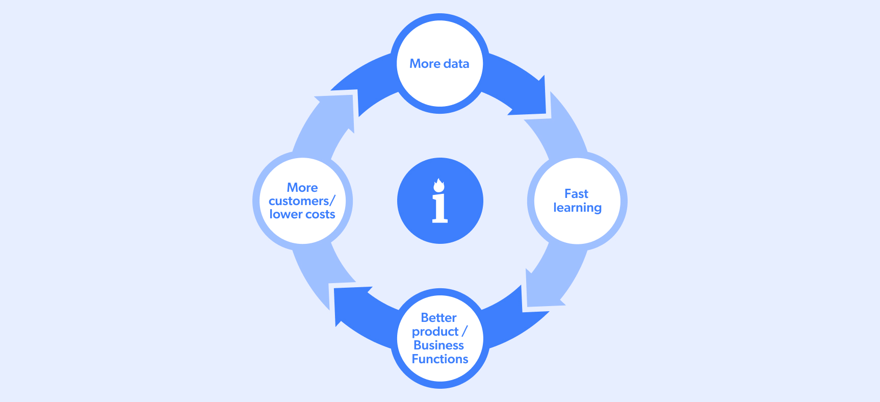 第一に、効果的なデータフライホイールは製品・サービスの継続的改善にデータを提供し、収益拡大と顧客増加を促進します。これは「好循環」として知られています:より多くのデータ→迅速な学習→優れた製品→より多くの顧客。このプロセスを繰り返すことで成長が加速します。