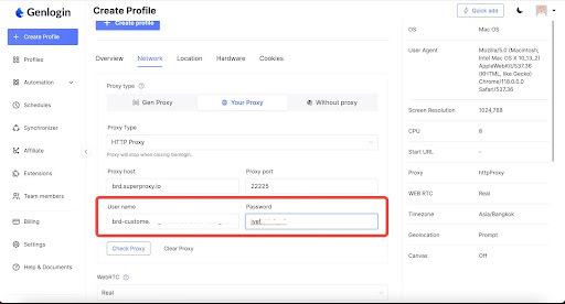 Bright Dataの「Proxies & Scraping Infra」に移動し、使用中のプロキシゾーンを選択してください。「Access parameter」オプションをクリックし、表示されたユーザー名とパスワードをコピーします。Genloginに戻り、コピーしたユーザー名とパスワードを対応するフィールドに貼り付けてください。