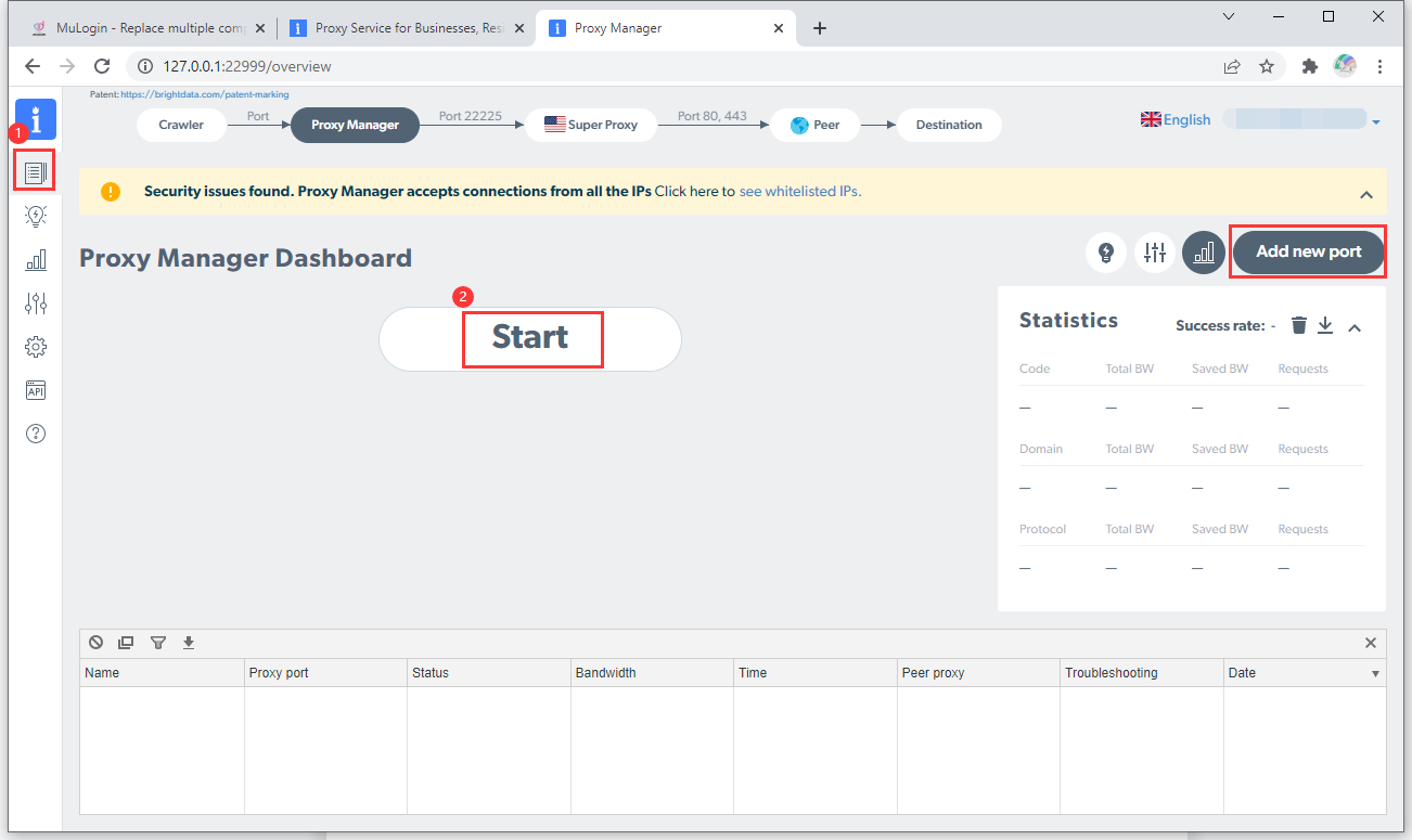 管理用のhttp://127.0.0.1:22999/ブラウザインターフェースが自動的に開きます。「スタート」または「新しいポートを追加」をクリックしてプロキシポートを作成します。