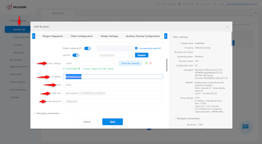 ブラウザを追加 -> 基本設定 -> プロキシ設定で以下の情報を入力します: