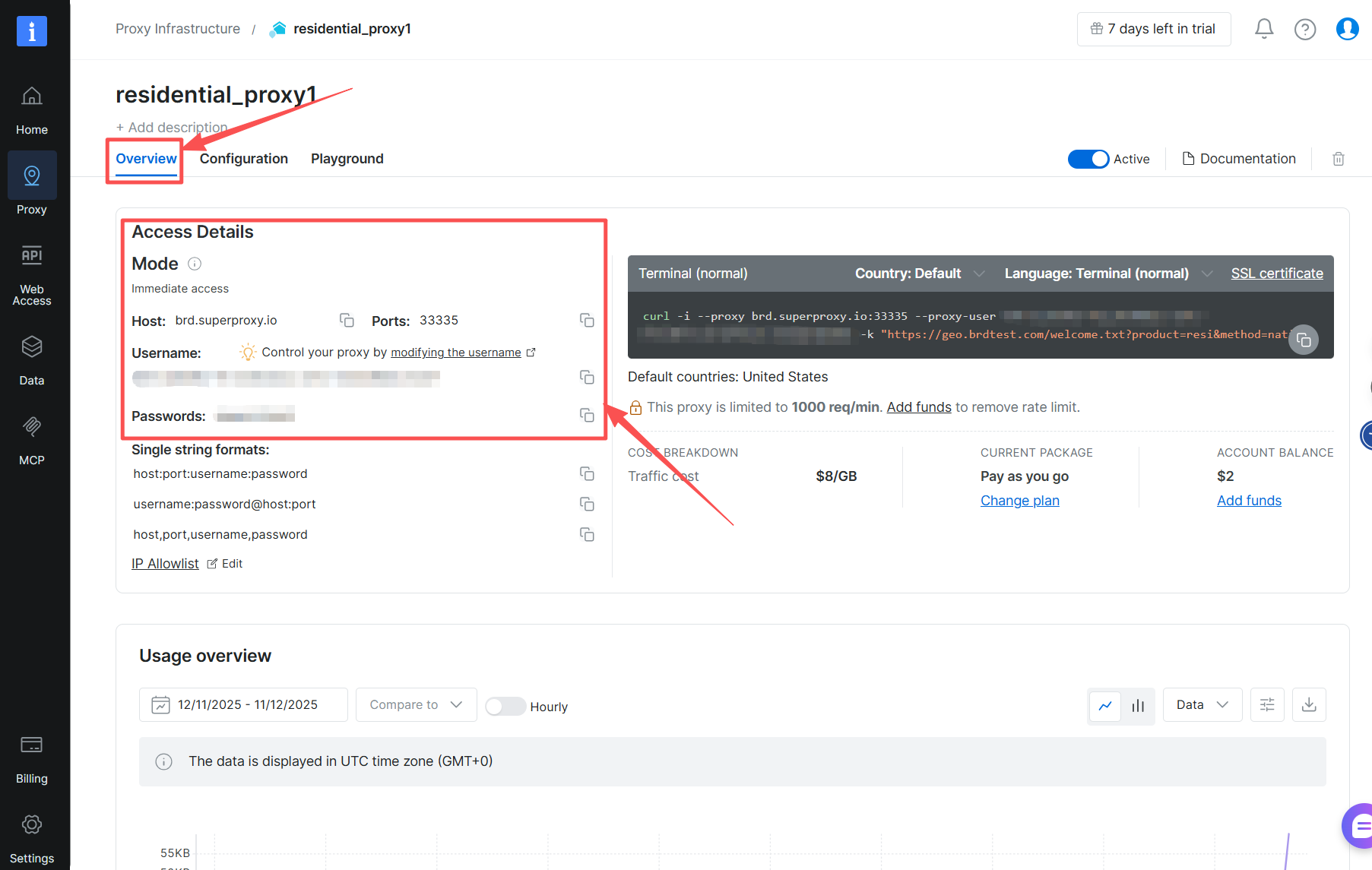 Bright Data にアクセスし、「プロキシ」セクションを選択します。「プロキシインフラストラクチャ」に移動し、使用中のプロキシゾーンを選択します。「概要」をクリックし、「アクセス詳細」オプションから提供されているユーザー名とパスワードをコピーします。