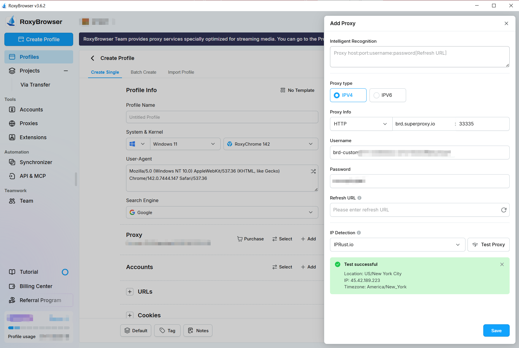 「プロキシテスト」ボタンをクリックし、「テスト成功」メッセージが表示されることを確認してください。「保存」をクリックしてブラウザプロファイルを保存します。