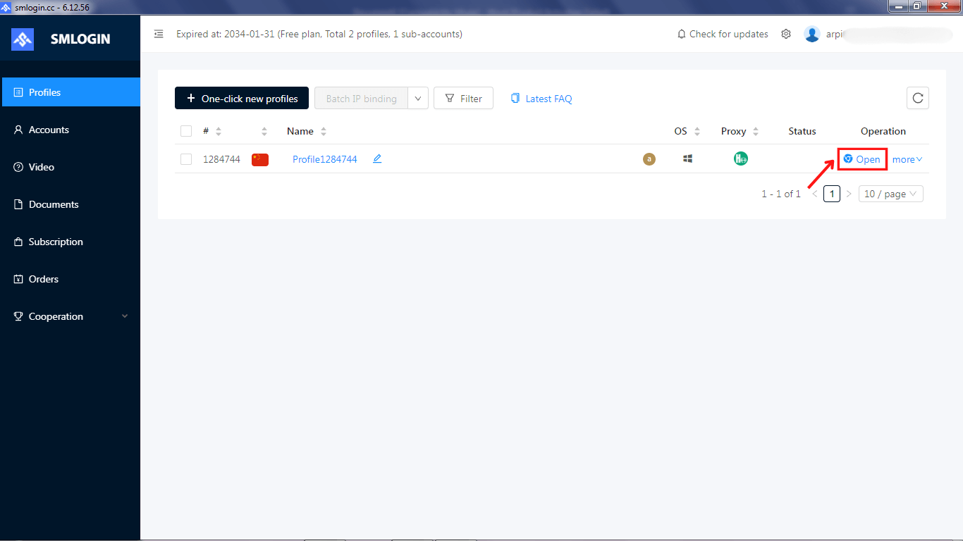 プロファイル設定が完了すると、ダッシュボードに表示されます。新規作成したプロファイルの横にある「Bind IP」オプションを見つけてクリックし、プロキシ設定の構成を進めてください。