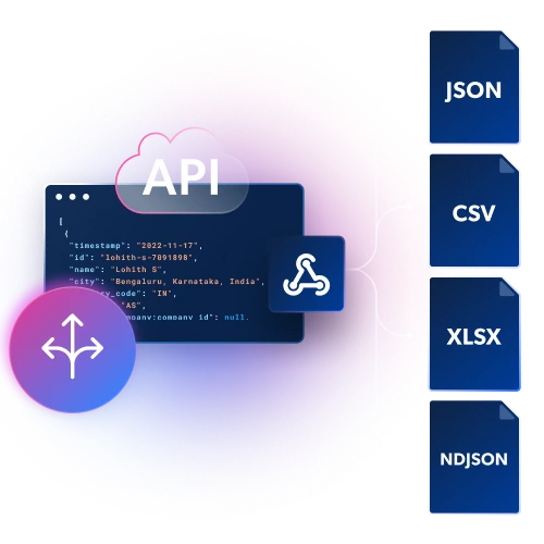 WebhookまたはAPI配信を通じて、JSON、NDJSON、またはCSVファイルで構造化データを取得。